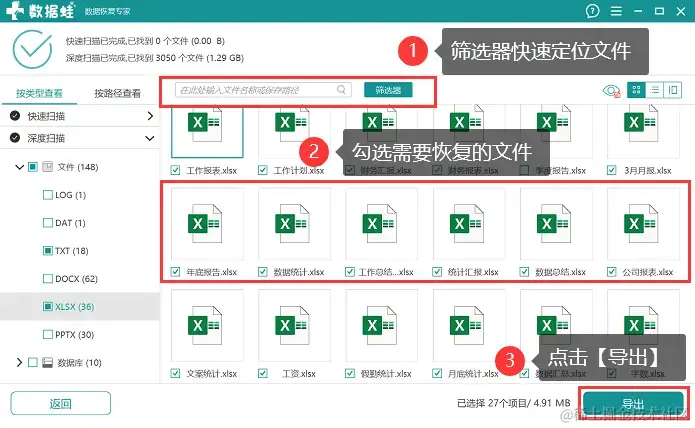第4步:软件执行完深度扫描操作后,用户可对扫描到的结果进行查看,此次扫描结束后,软件所呈现的数据会比较多,建议用户在【筛选器】中对数据进行定位,找到需要恢复的文件后将其勾选上,并点击 【导出】 。