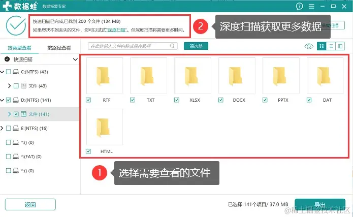 第3步:软件将执行扫描操作,等待扫描完毕,用户可查看到少部分扫描结果,查看时可根据个人需求选择按【类型】或 【路径】 查看,若没找到相应数据,点击【深度扫描】可获取更多数据;
