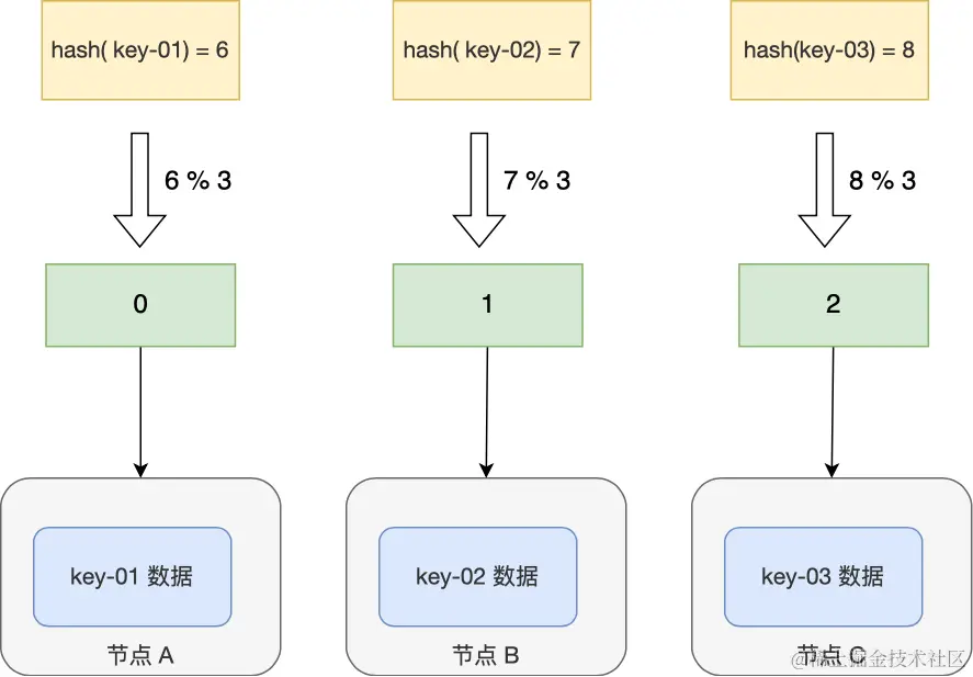 纵向扩容最可能出现的问题是由于节点增多,如果使用普通哈希算法存储缓存,如果只有一组缓存(大部分场景都够用),可能会导致扩容后缓存全部失效,此时会导致极高的系统风险。下图对风险进行了详细介绍: