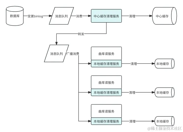 曲库的最佳实践是只有清理中心缓存的服务直接监听binlog消息,在清理完中心缓存后再将消息转发到另一个消息队列,清理本地缓存的服务监听新的消息队列,这样就能实现有序清理缓存的目的。在清理本地缓存时,我们提供了一个清理sdk插件,嵌入曲库读服务,每个服务在启动时会实例化一个独立的消费者,这样虽然对业务有部分侵入,但由于每个消费者只需要清理本地缓存,曲库读服务的扩缩容会变得异常简便,也更适用于当前容器化部署的形式。具体流程图如下:
