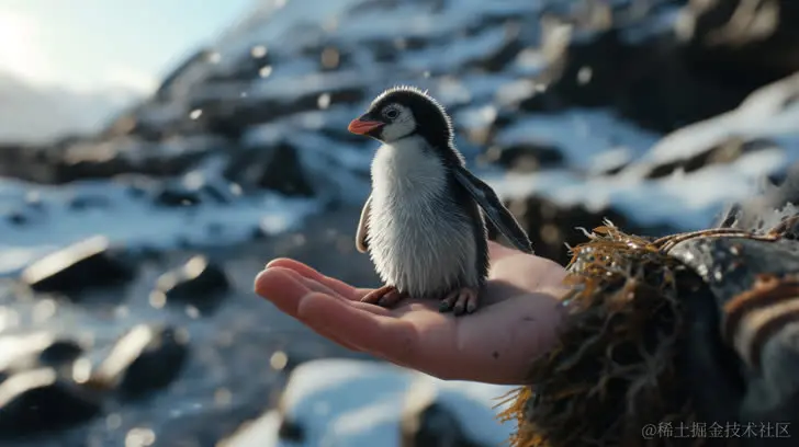 以虚幻引擎5风格呈现的手掌上拿着一只微小的企鹅,照片般逼真的景观,动物艺术,32k超高清,写实风格场景,注重大气效果