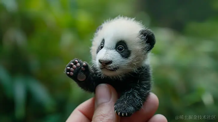 一只微小的熊猫宝宝坐在人指尖上,采用照片般逼真的技术,创新的技术手法,以大自然为灵感的图像