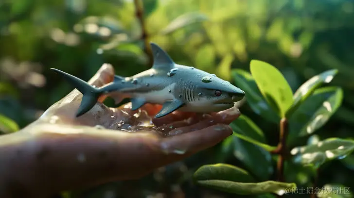 微小的鲨鱼宝宝站在人手中,采用vray追踪风格,电影剧照,照片逼真的夸张手法,虚幻引擎5,网站,自然场景,逼真摄影技巧