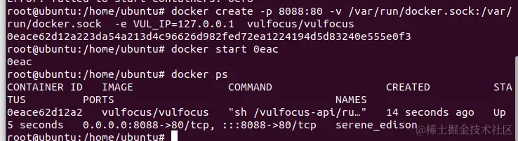 docker create -p 8088:80 -v /var/run/docker.sock:/var/run/docker.sock -eVUL_IP=127.0.0.1 vulfocus/vulfocus
