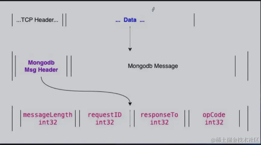 由于作者本人的电脑为MAC M系列芯片,对eBPF不怎么兼容,所以我们下面只讲原理,如下图是mongodb通信协议,基于这个协议,可以知晓消息内容、操作类型、响应码等。