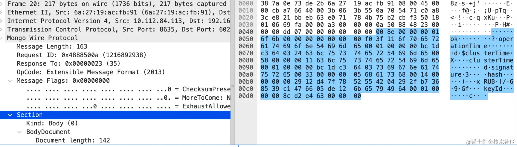 可能有人会问eBPF是怎么抓取数据,因为进入系统内核都是二进制数据,如何知晓是kafka或者mongodb的数据,答案是基于通信协议,每个中间件都是属于自身的通信协议,比如 redis、mysql、mongodb等,以下为mongodb的原始通信报文,这个报文每几位代表什么含义,在mongodb官方文档都有定义