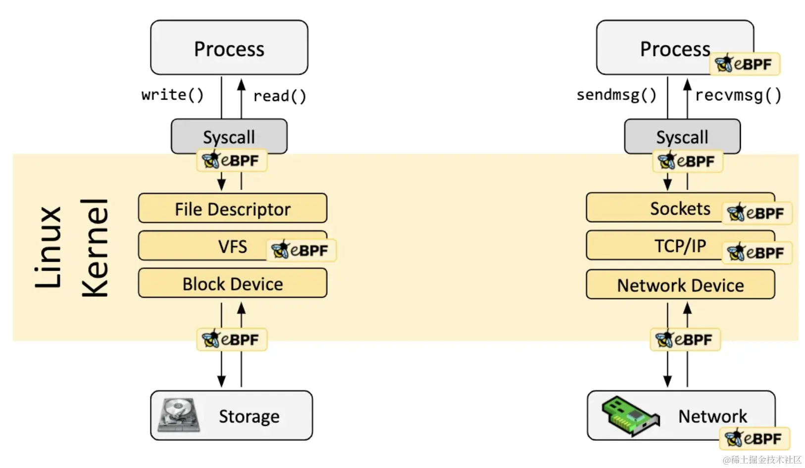 如下图,eBPF可以在文件写入和读取进行拦截处理,网络的发送和接受进行拦截处理