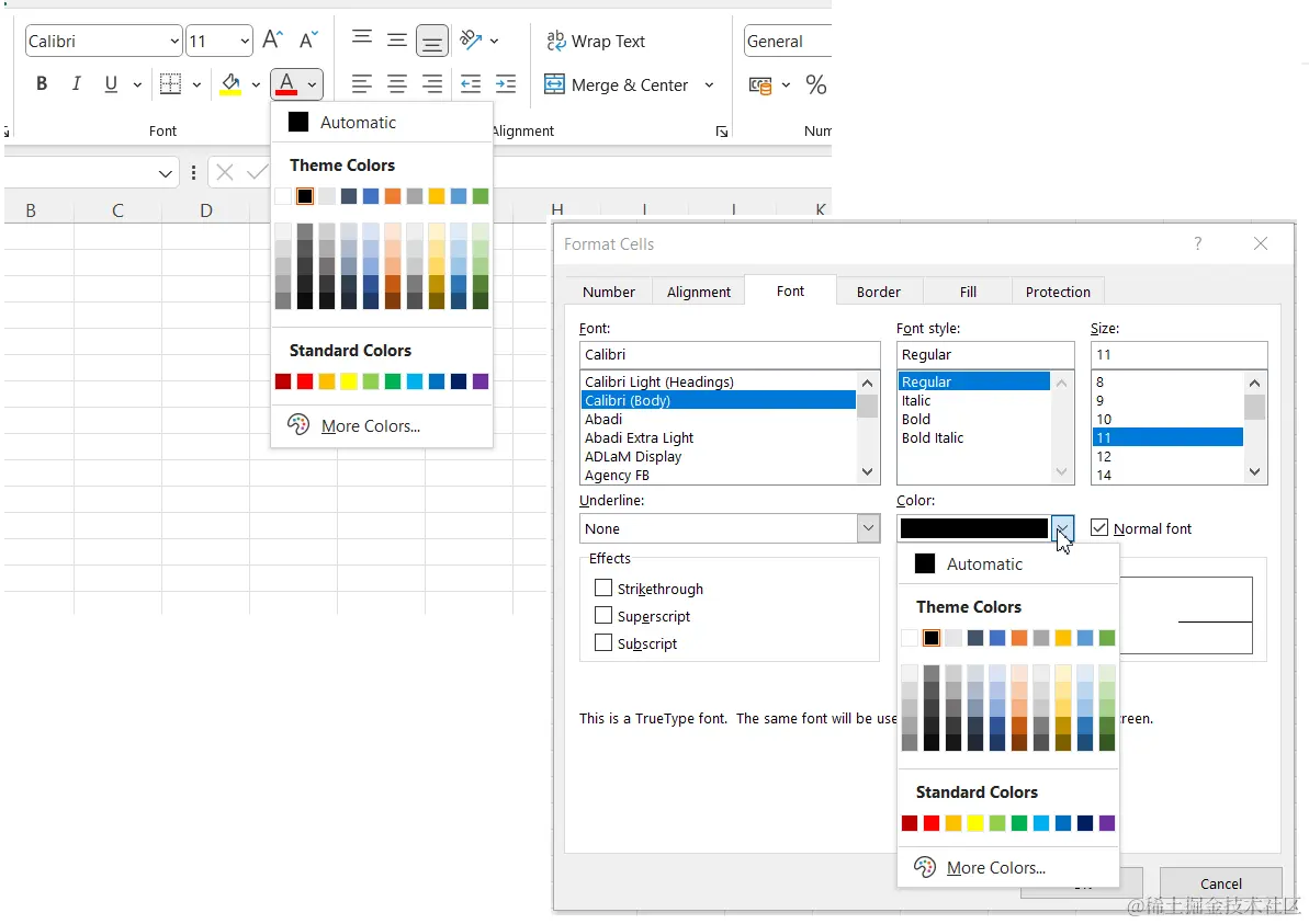 在 Excel 中,可以使用“工具栏”或“设置单元格格式”对话框中的调色板添加文本颜色,如下所示: