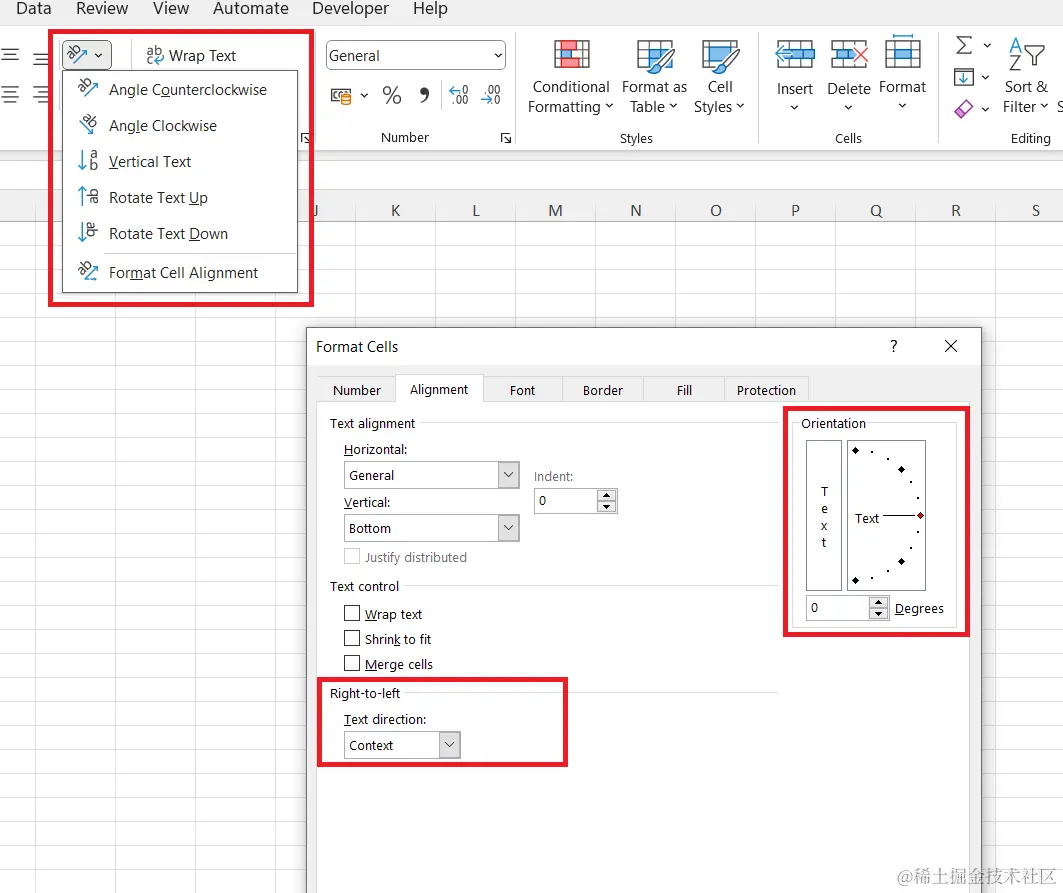 Excel 中的“文本方向”和“文本旋转”设置有助于特定语言的样式设置。文本方向配置书写方向 - 从左到右 (LTR) 或从右到左 (RTL),可用于阿拉伯语等语言。文本旋转设置文本的角度,对于垂直文本(如 CJK)特别有用。