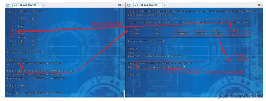 新id为1的数据,也要为id为1的数据加排他锁,但是客户端二会处于阻塞状态,因为排他锁之间是互