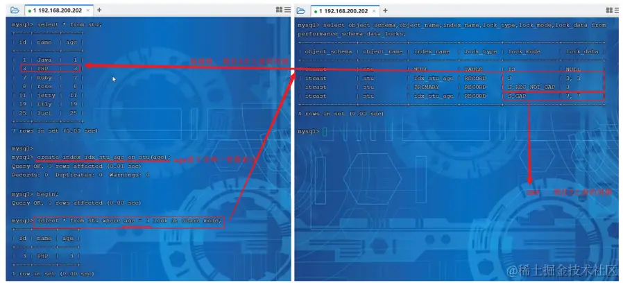 - InnoDB的行锁是针对于索引加的锁,不通过索引条件检索数据,那么InnoDB将对表中的所有记