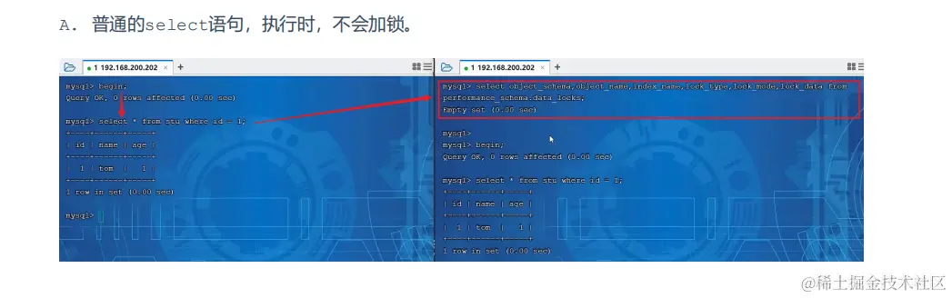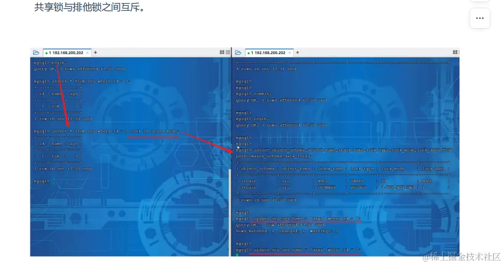 数据。 而如果客户端二想获取id为1这行的排他锁,会处于阻塞状态,以为共享锁与排他锁之间互