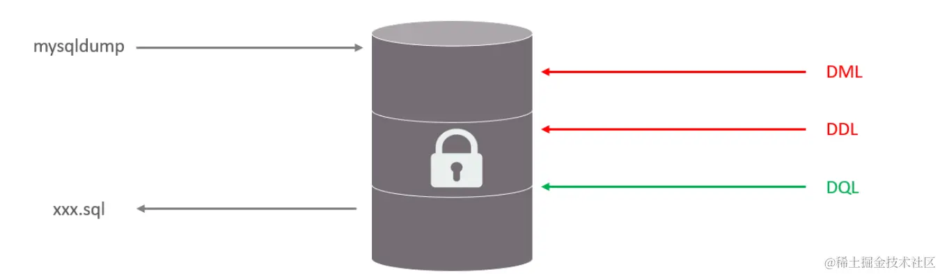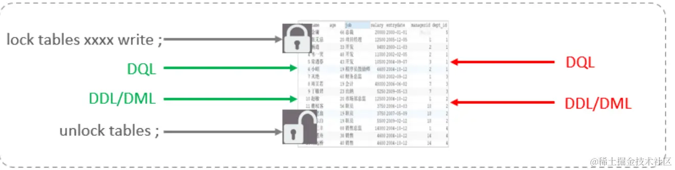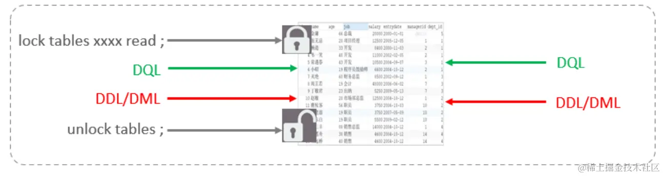 全局锁就是对整个数据库实例加锁,加锁后整个实例就只能处于只读状态,DML写语句,DDL语句,以及更新事务操作的提交语句都会被阻塞。