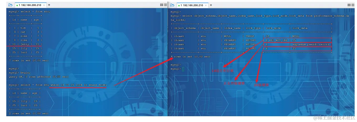查询的条件为id>=19,并添加共享锁。 此时我们可以根据数据库表中现有的数据,将数据分为三个部