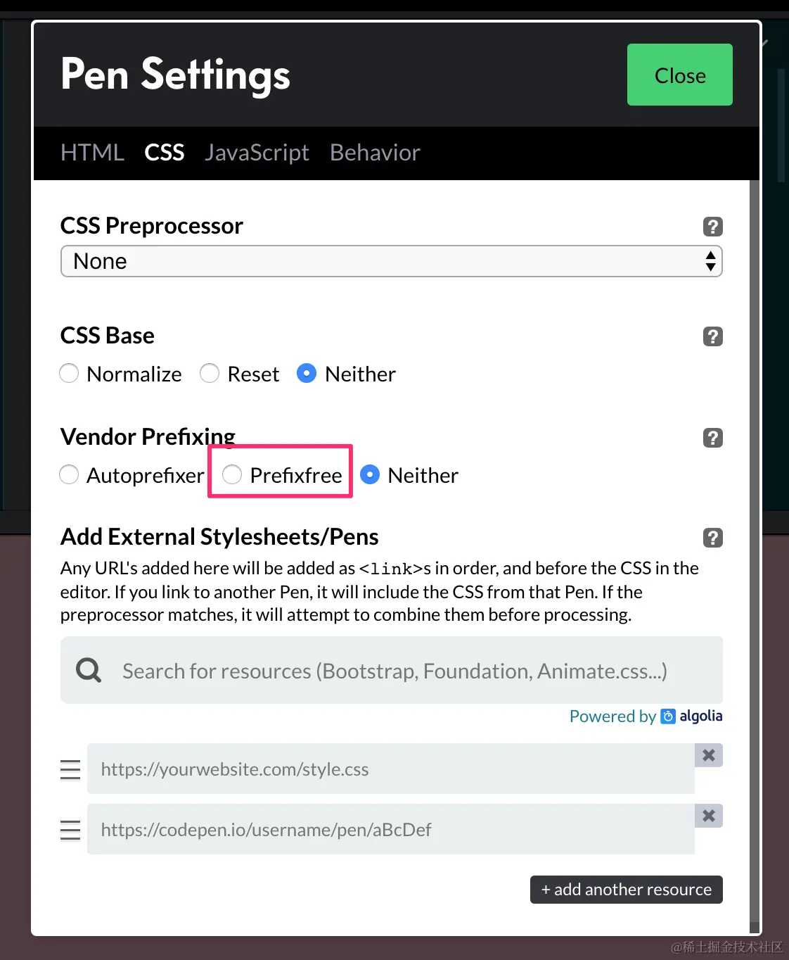 这种方式到目前为止来说有点过时了,但在一些在线编辑器还是提供了相应的选项,比如Codepen在线编辑器就提供了相应的选择: