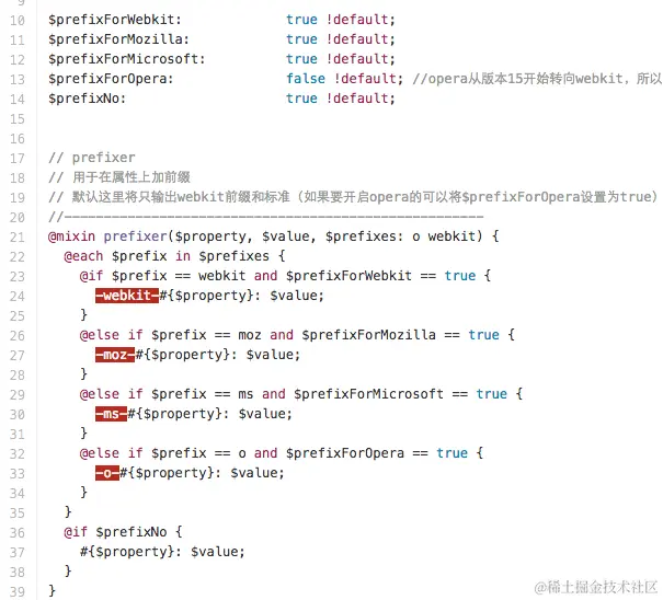 随着CSS处理器越来越普及,部分同学开始采用CSS处理器来处理浏览器私有前缀。比如早期的Sass中,通过处理器中的混合宏来处理私有前缀,其中最有名的应该是Compass了,他就是使用Sass的mixin为CSS需要带有前缀的属性定制了一些mixin。还有类似于Stylus中的nib等。这些混合宏确实可以解决很多问题,但也产生了新的总是,就是它所使用的语法是全新的,如果要使用就必须重新学习,另外这类工具的演进速度通常都会跟不上浏览器的发展速度,这样也会造成其产生的CSS有过时的问题,有时候为了解决一些问题,还需要自己去写mixin,比如下图所示: