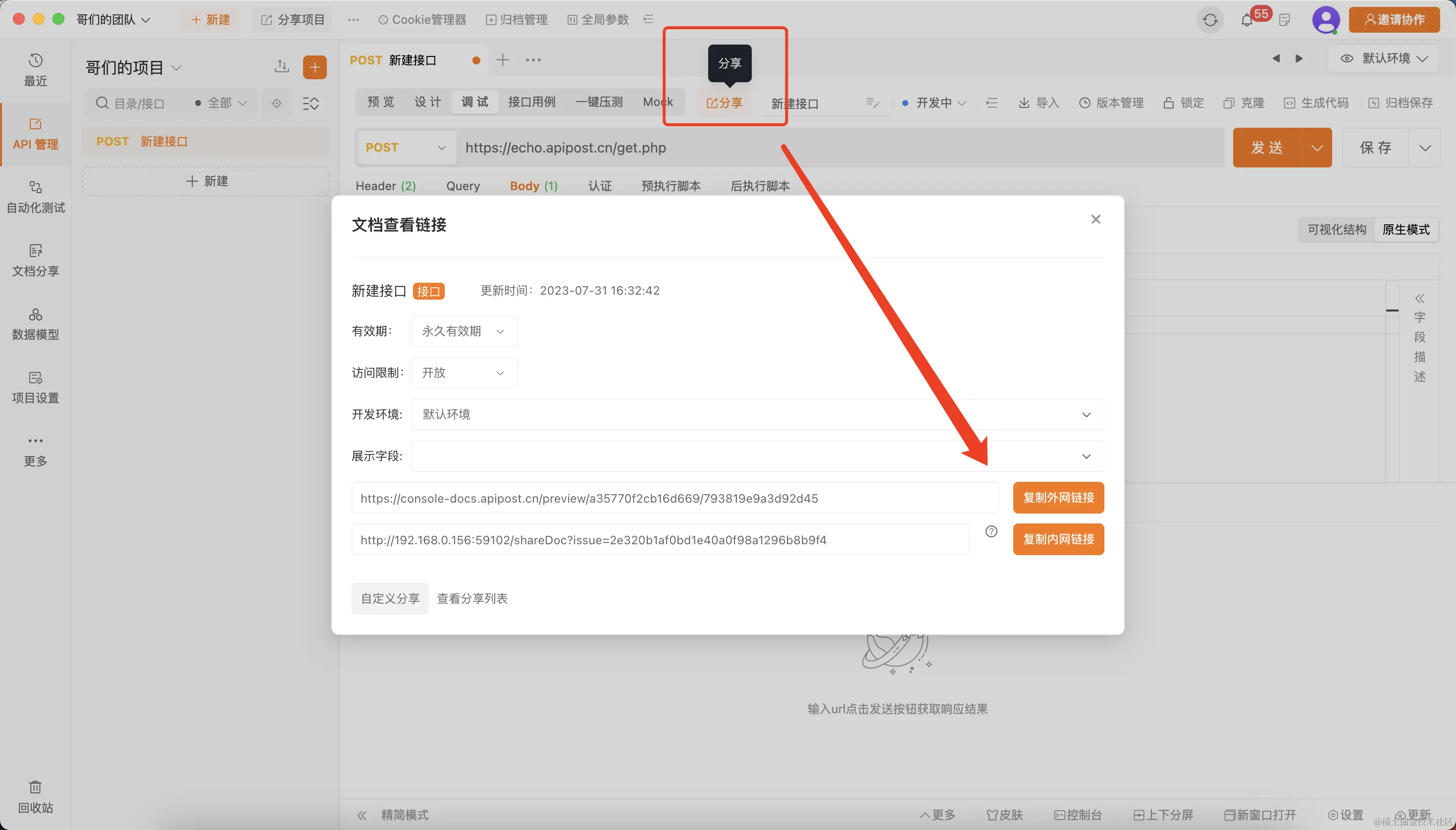 使用Apipost,只需要按下“分享文档”按钮,就能够自动生成漂亮、规范的接口文档,并提供自定义分享有效期及权限的功能。文档可以设置有效期、开放和密码查看、批量分享、分享管理、支持导出word、html、markdown格式等多种功能。这意味着,团队成员可以快速轻松地生成、查看和分享接口文档,大幅度节省了不必要的时间消耗,同时,也提高了沟通协作的效率。这样,团队成员都能够专注于自己的主要工作,而无需耗费过多时间和精力去编写和管理接口文档。