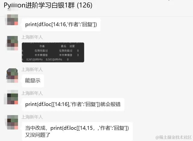 后来【论草莓如何成为冻干莓】给了一份代码,print(df.loc[[14, 15],'作者':'回复'])。继续延伸下,如下图所示: