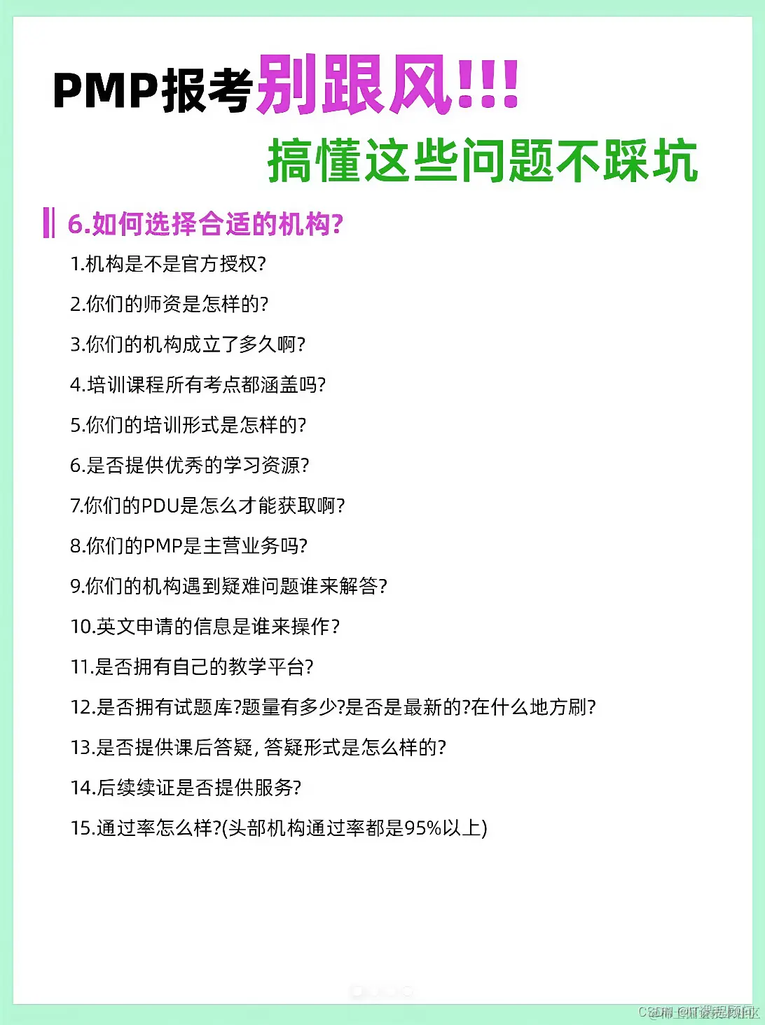 最后,我想说的是,报考PMP认证需要认真考虑自己的职业规划和兴趣,充分了解PMP认证的要求和标准,选择合适的机构并认真准备考试。只有这样,我们才能够顺利通过考试并获得PMP认证,提升自己在项目管理领域的专业知识和能力,获得更好的职业机会和发展空间。
