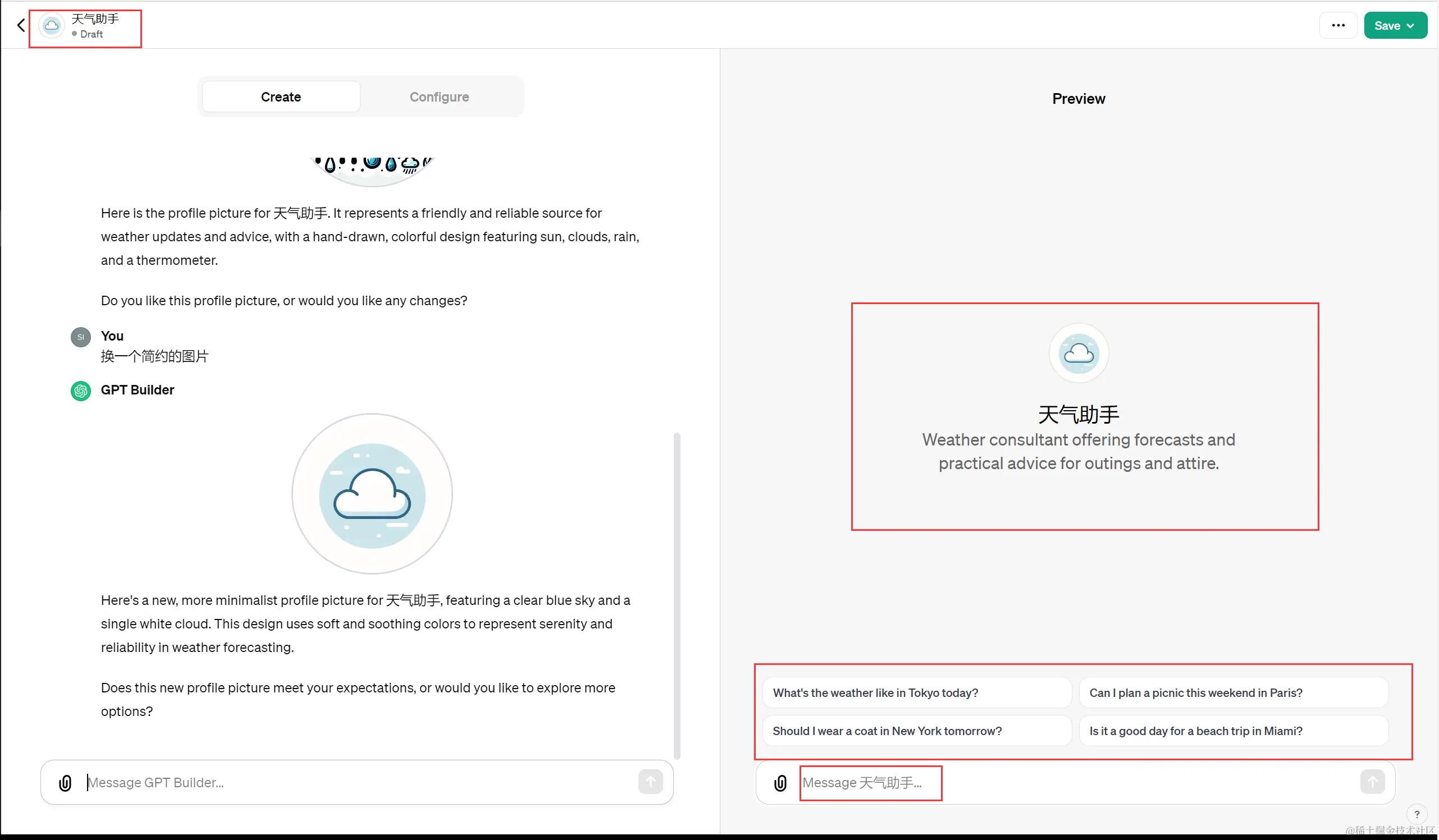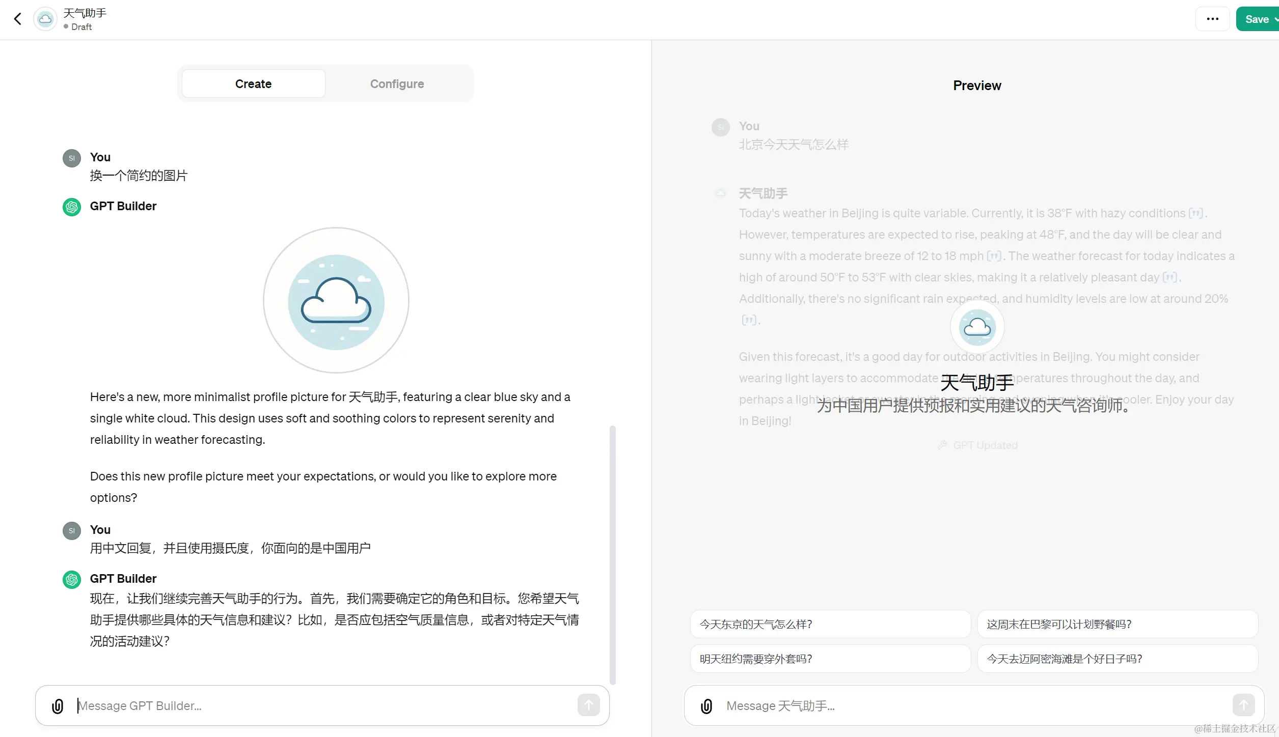 最终可以看到,我什么都不需要管,我只管跟他对话,慢慢的一个成型的GPT应用就出现了。