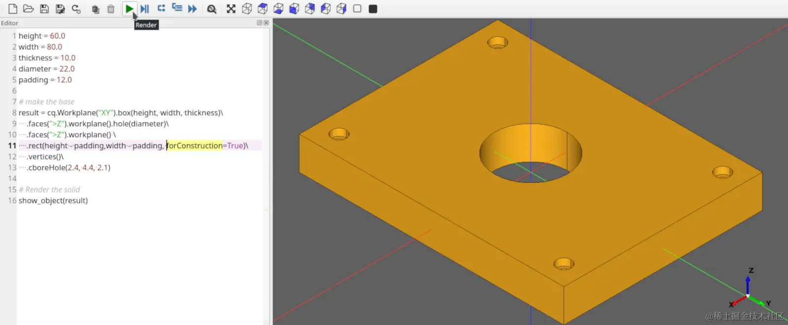 现在不用担心 CadQuery 的语法,你可以在稍后的 API 参考中学习到所有相关知识。