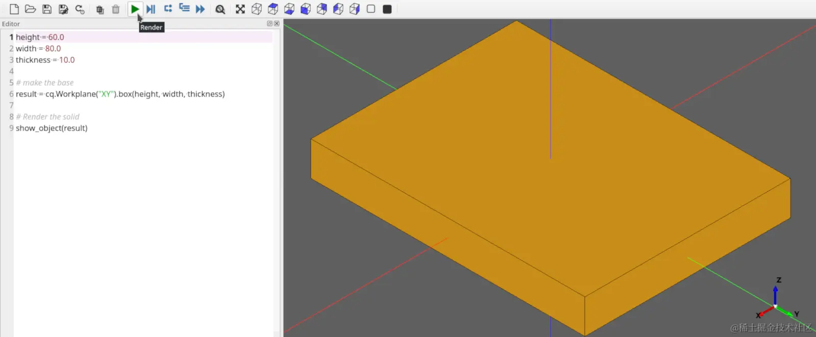 找到左侧的 CadQuery 代码编辑器。您将看到我们从一个简单块的脚本开始。