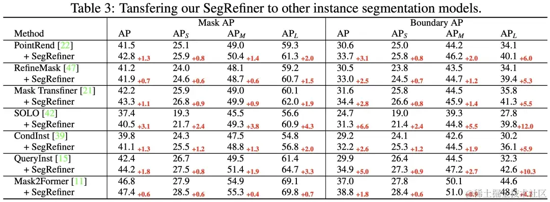 然后在表3中,我们将 SegRefiner 应用于其他7种实例分割模型。我们的方法在不同准确度水平的模型上都取得了显著的增强效果。值得注意的是,当应用于三种 Model-Specific 的实例分割 Refinement 模型(包括PointRend、RefineMask 和 Mask TransFiner)时,SegRefiner 依然能稳定提升它们的性能,这说明 SegRefiner 具有更强大的细节感知能力。