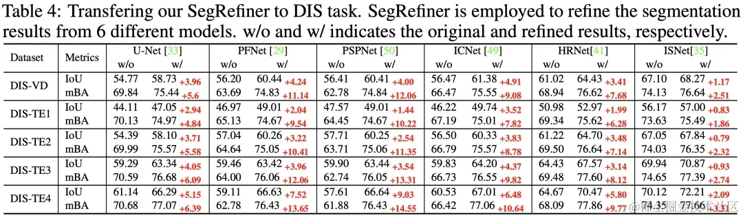 在本实验中,我们将 SegRefiner 应用于6种分割模型,结果如表4所示。可以看到,我们的SegRefiner在 IoU 和 mBA 两项指标上都明显提升了每个分割模型的准确度。