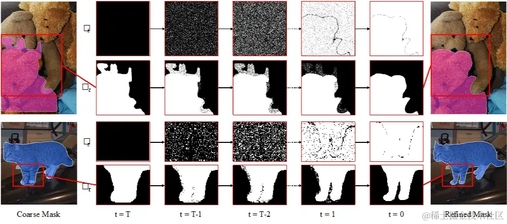 在这一想法下,我们提出了一个新的视角:将粗糙 mask 视作 ground truth 的带噪版本,并通过一个去噪扩散过程来实现粗糙 mask 的 Refinement,从而将 Refinement 任务表示为一个以图像为条件,目标为精细 mask 的数据生成过程。