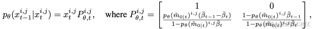 故同样可以被视作每个像素处于“精细状态”的概率。为了获得反向状态转移概率,根据前向过程的设定和贝叶斯定理,延续 DDPM 的做法,我们可以由前向过程的后验概率和预测得到反向过程的概率分布,为: