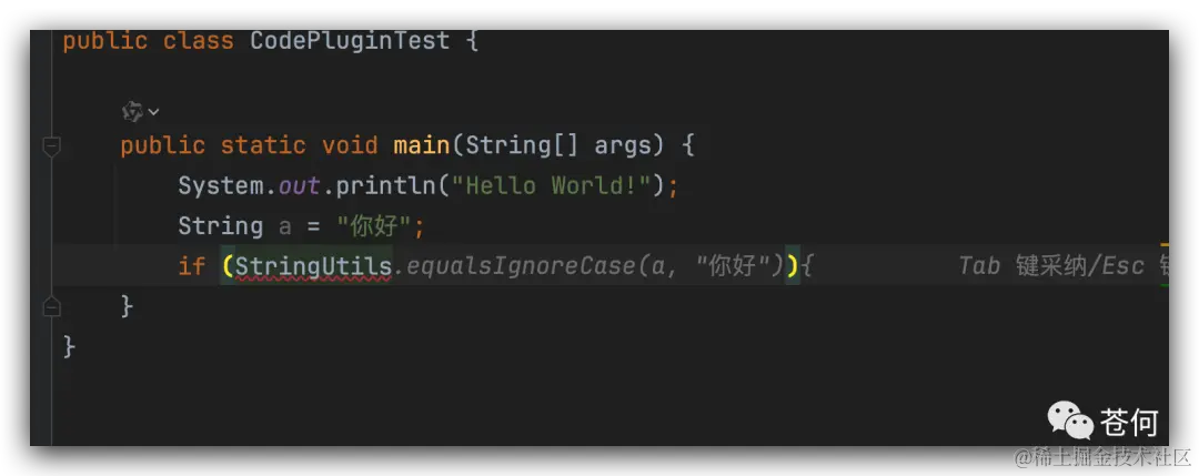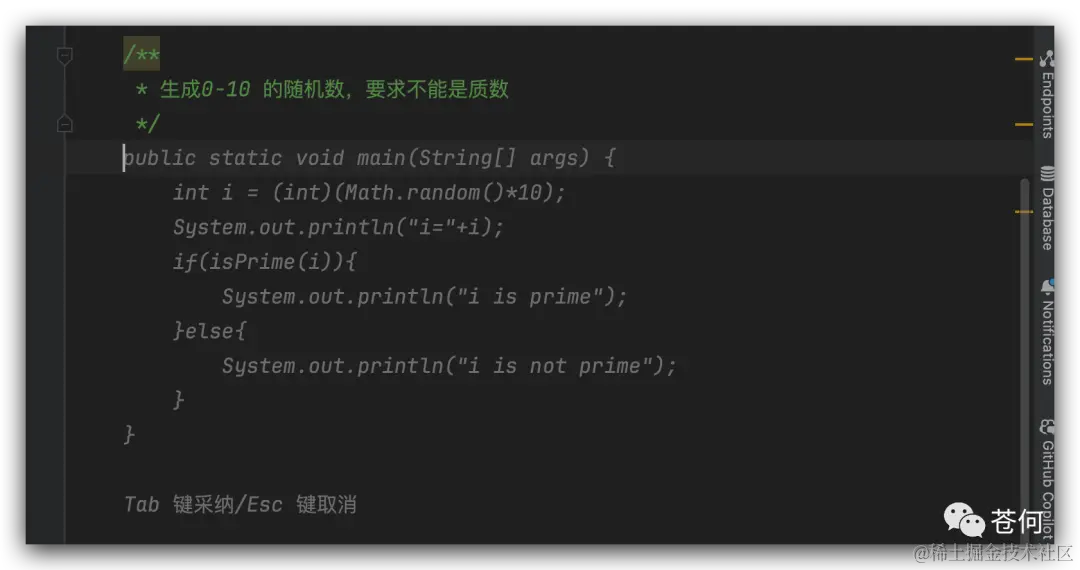 按 Tab 键采用提示编码,CodeFuse 并没有直接把 main 方法补全完,而是只补全最核心的一行,缺少方法另外一个括号。相对 GitHub copilot 来说,我觉得这这更加符合程序员编码习惯以及符合 idea 的默认换行补全方式。在 idea 中,写完一个方法的左括号,按换行,直接就可以补全右括号,而我们确实只需要他生成单行即可。