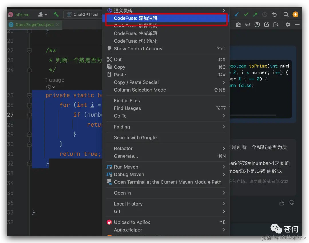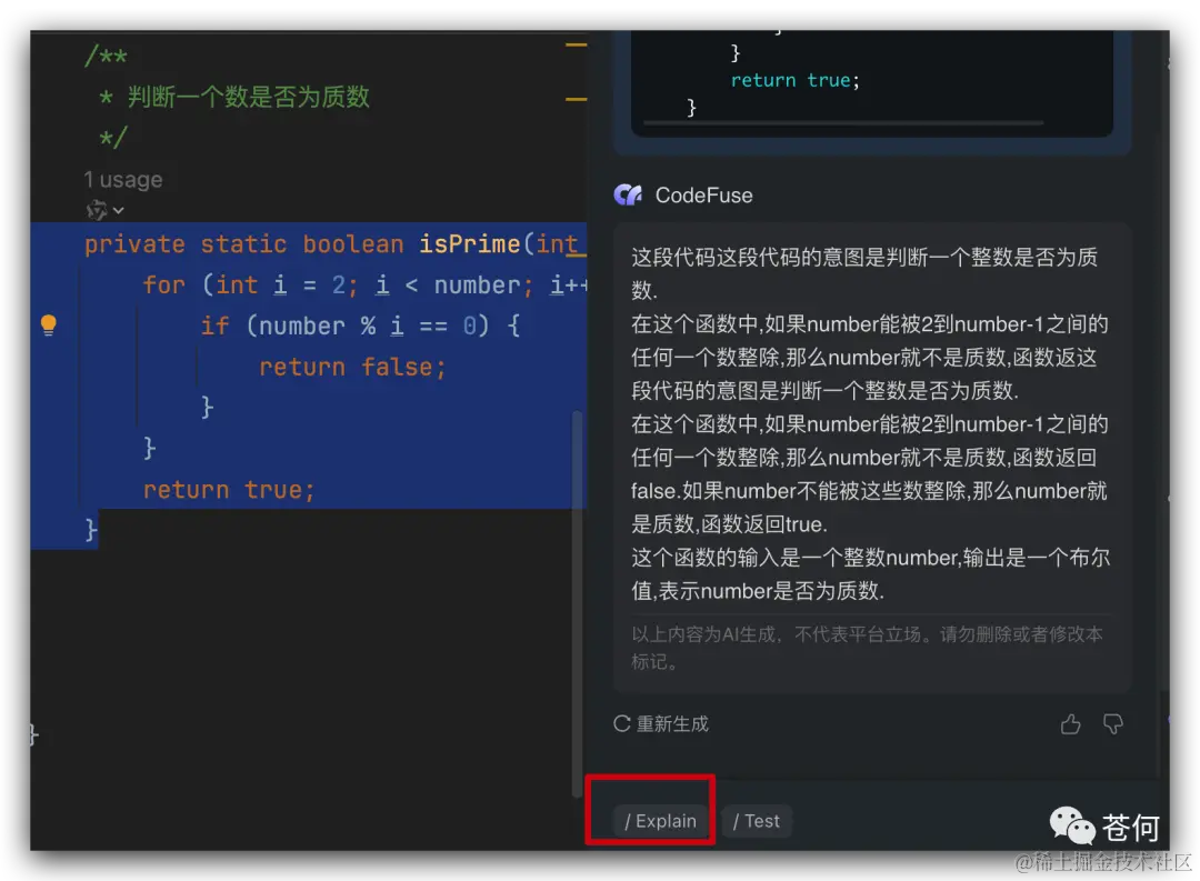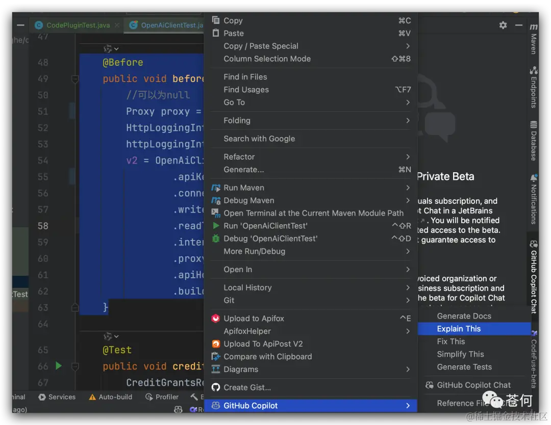 我们知道在 IntelliJ IDEA 中安装 GitHub Copilot 并不能召唤出 chat 功能,目前这个功能还处于测试阶段,但 CodeFuse 直接就可以召唤出 chat 功能,并能很好的解释代码。