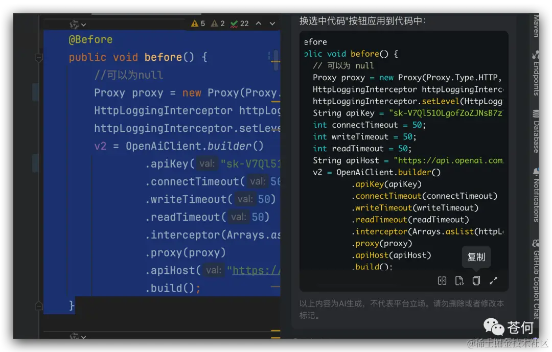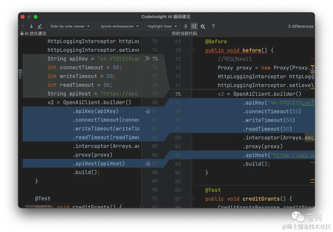 可以直接采用替换原先代码,或者复制代码,最好用的是可以进行前后代码比较,看看 CodeFuse 究竟帮我们改了哪些,很直观。