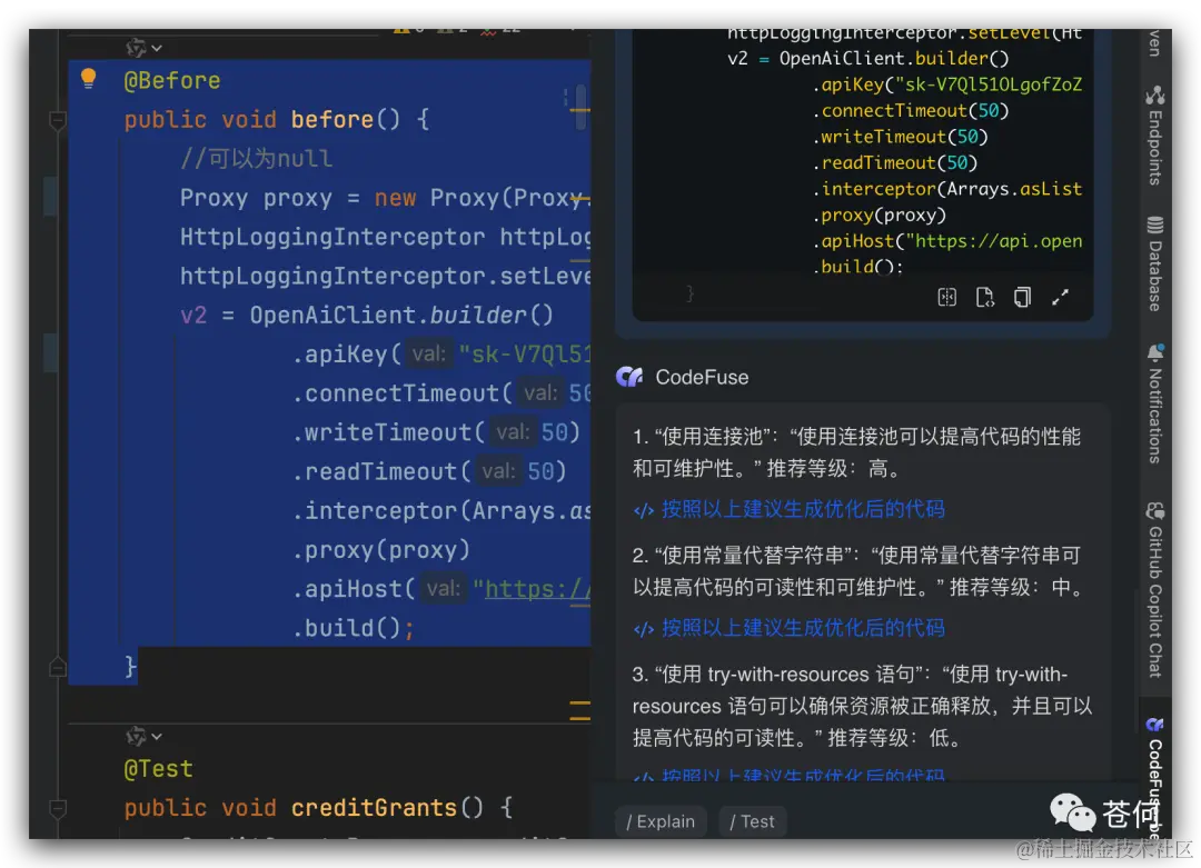 右键需要优化的代码,可以看到CodeFuse 为我们生成的优化建议。