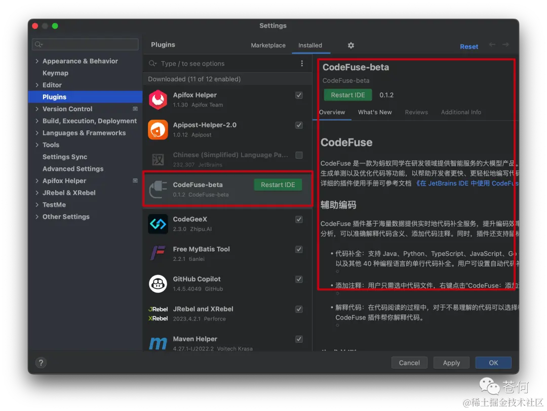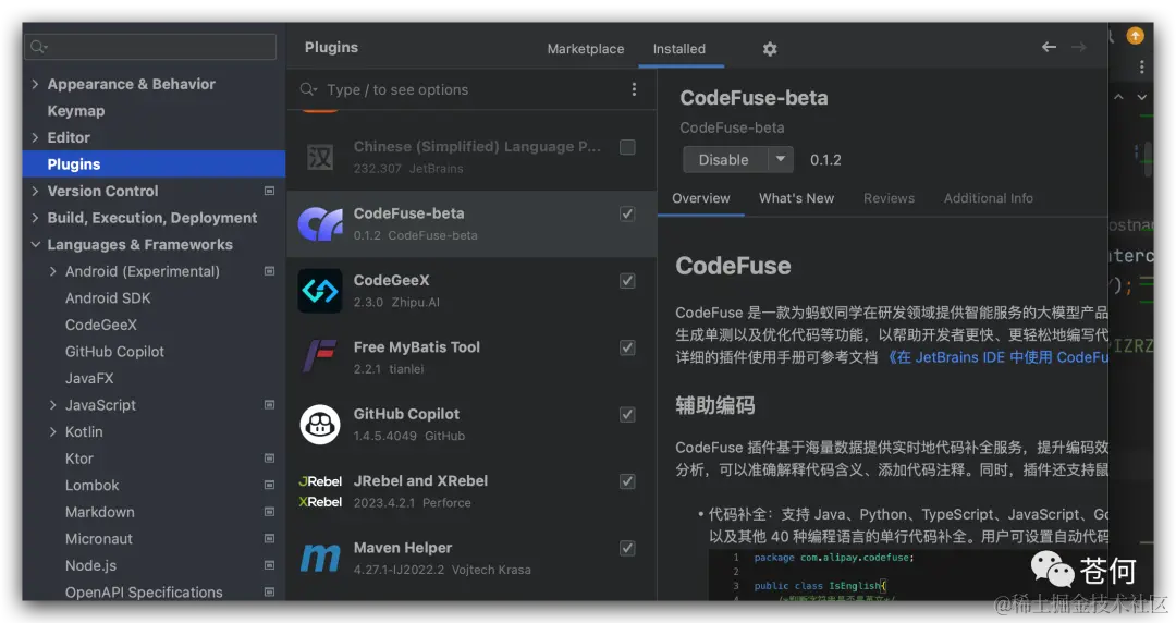可以看到我的 idea 已经安装了 GitHub Copilot、CodeGeeX、通义灵码,为了接下来和其他插件进行对比,在代码补全部分,单次仅开启一个插件,尽量保证实验客观真实。