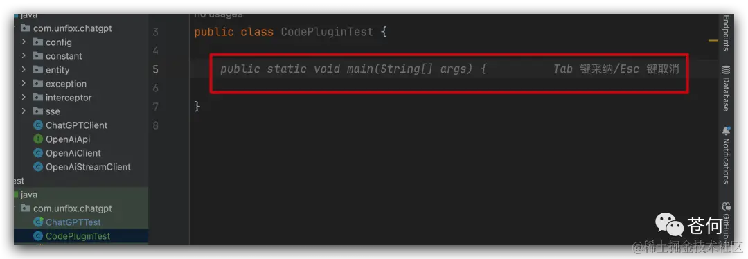 这个时候代码补全只有CodeFuse 启用,我们先建一个空类,什么都不写,直接按换行看看: