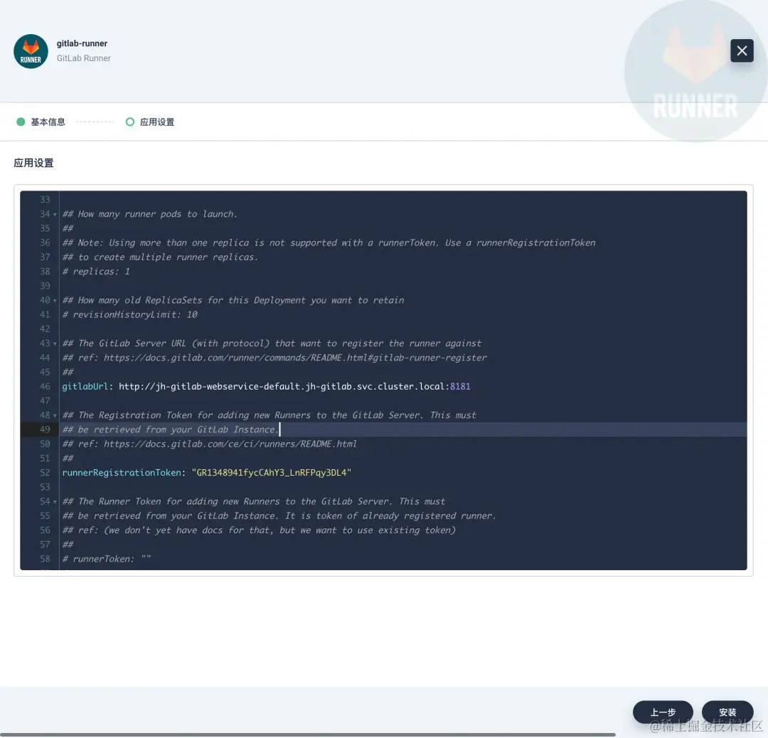 选择 gitlab-runner,然后设置应用名称,继续点击下一步,开始修改部署参数。