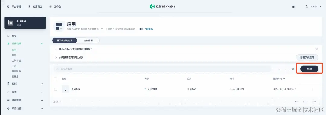 目前在 KubeSphere 上部署极狐GitLab 非常便利,只需要利用 KubeSphere 的应用商店即可一键部署。