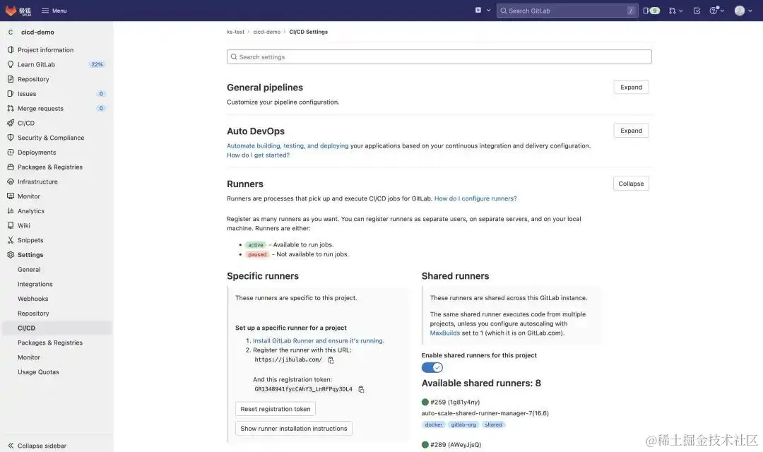 其中,gitlabUrl 的值为极狐GitLab 的可视化界面地址,runnerRegistrationToken的值可以设置为想要使用该 Runner 的项目的 CI/CD Specific runners 的 registration token,例如: