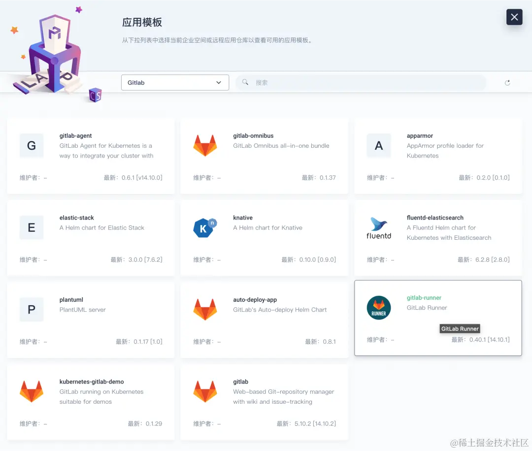 然后选择『从应用模板』,在弹出面板的下拉框中选择 GitLab。