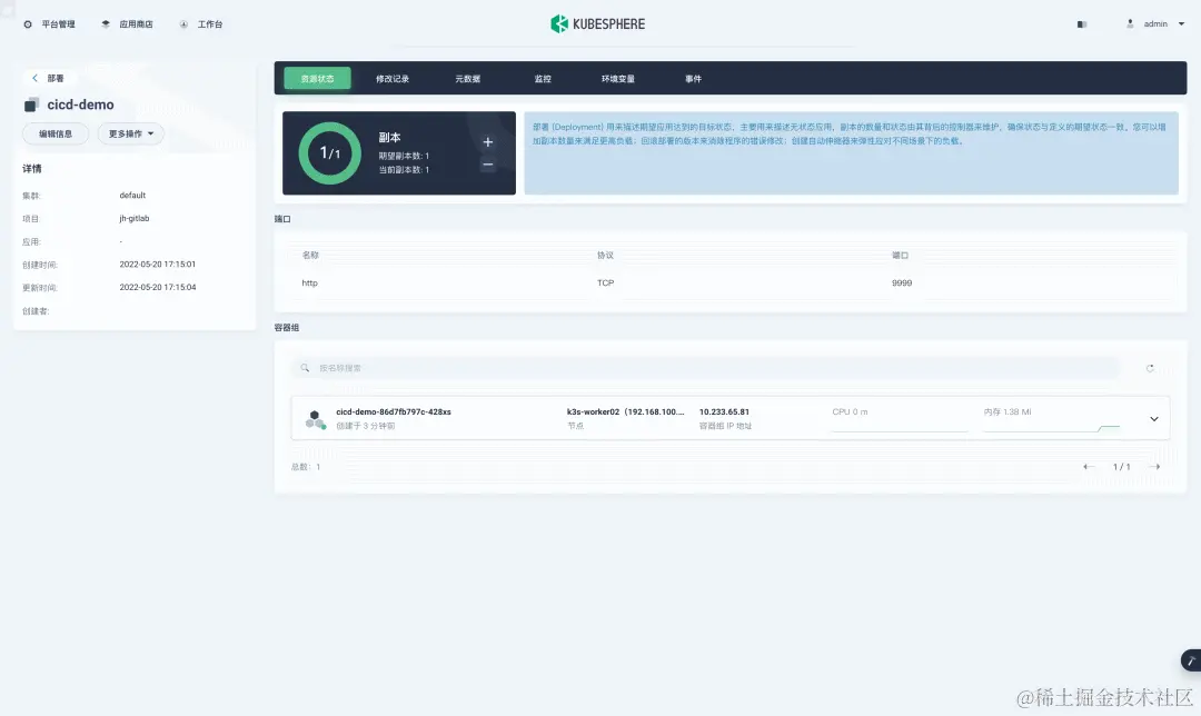 从 KubeSphere 可视化界面里可以看到应用被成功部署了。最后可以测试一下这个 HTTP Server 是否正常工作: