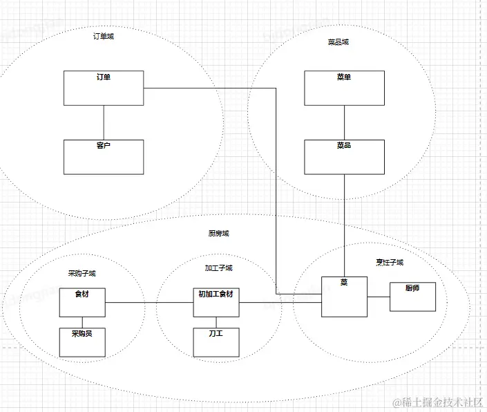 例如:厨房域(厨师服务、刀工服务、采购员服务),菜品域(客户服务、管理者服务)。