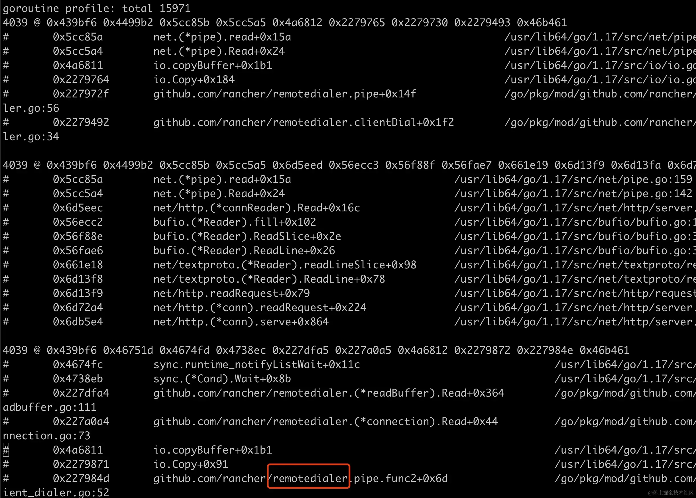 可以看到有一个明显看起来不合理的 remotedialer 模块的 go 协程数量加起来有接近 12000 个,于是去分析它的协程是如何创建的,为什么没有及时退出。