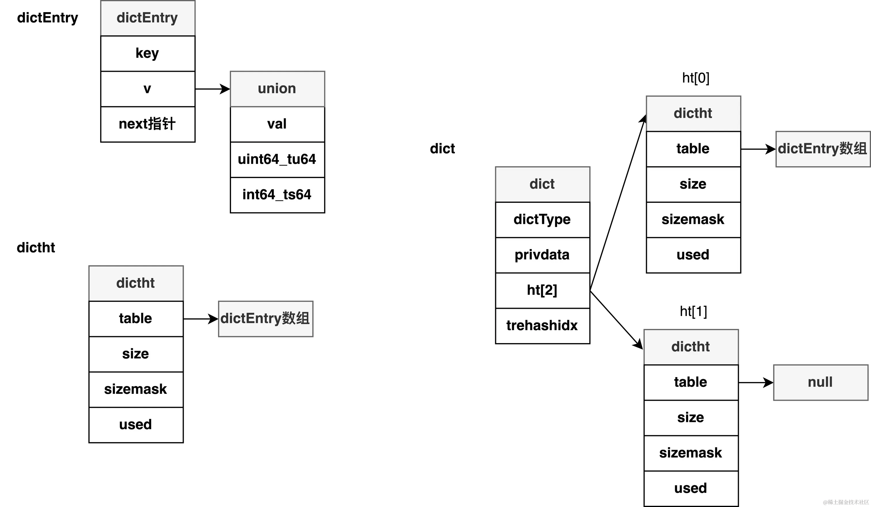 dictEntry中的v属性可以是一个指针,或者是一个uint64_t整数或者int64_t整数。next属性是指向两一个dictEntry的指针,这个指针可以将多个哈希值相同的键值对链接在一起,解决哈希冲突的问题。