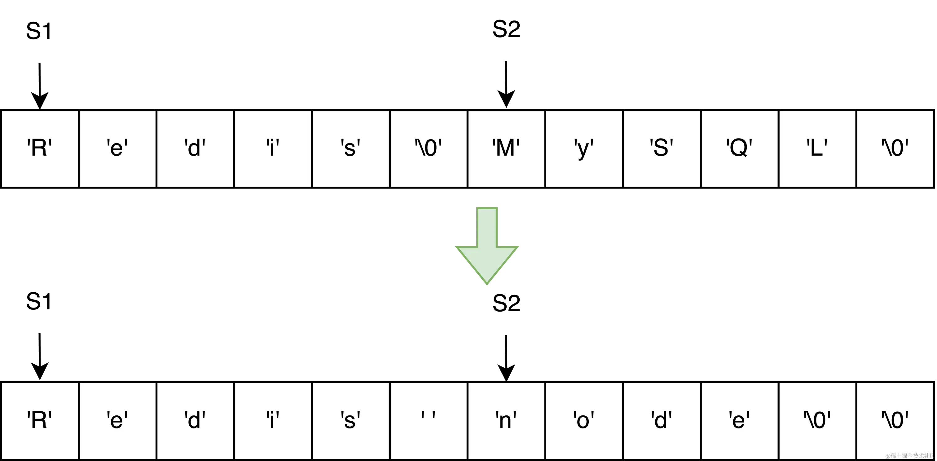 - 上图展示的就是使用C语言的strcat()函数导致字符串S1溢出到S2的部分了。